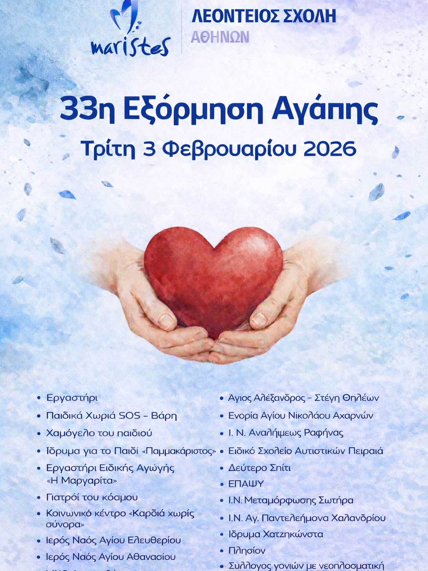 Στο πλαίσιο αυτό, την Τρίτη 03 Φεβρουαρίου 2026, όλα τα Τμήματα του Γυμνασίου και του Λυκείου μας θα επισκεφθούν φορείς και ευαγή ιδρύματα και θα προσφέρουν τρόφιμα και είδη πρώτης ανάγκης που έχουν συγκεντρώσει οι ίδιοι/-ες οι μαθητές/-τριές μας.