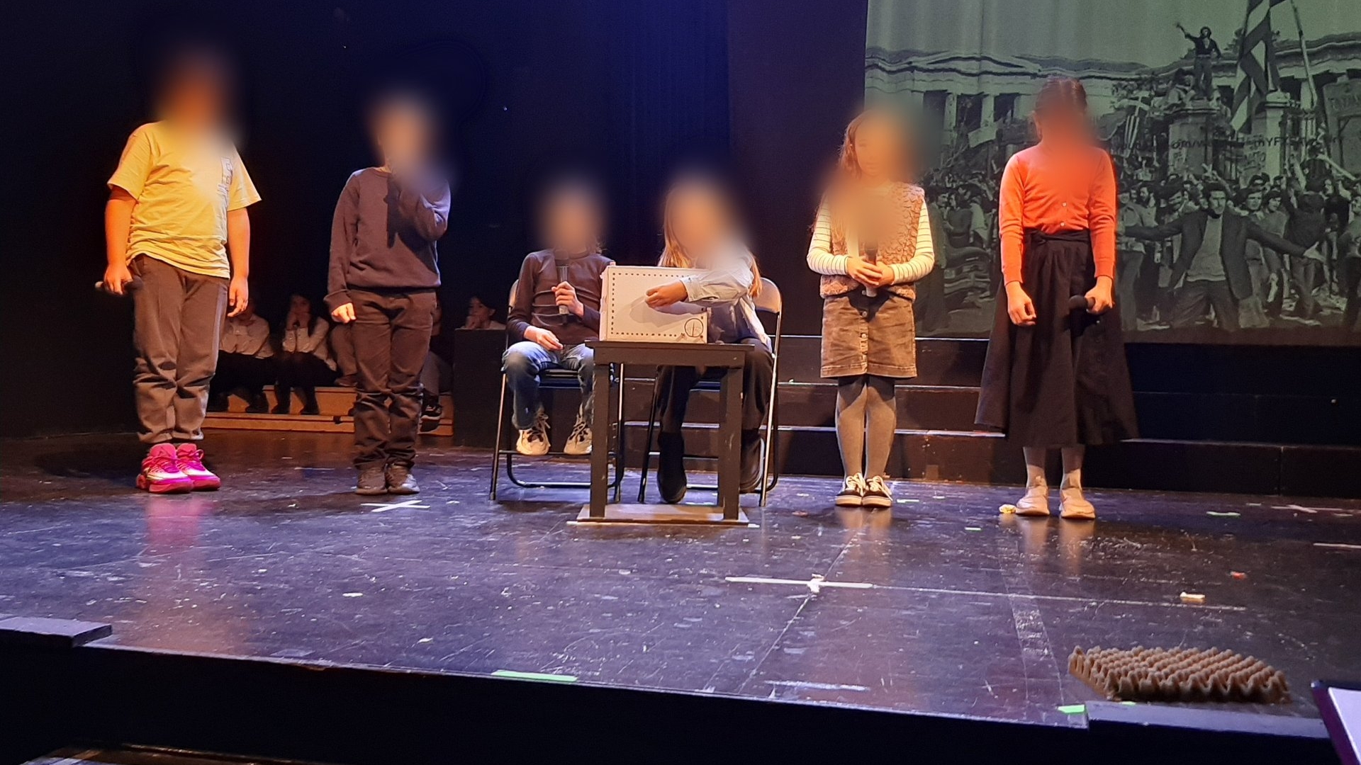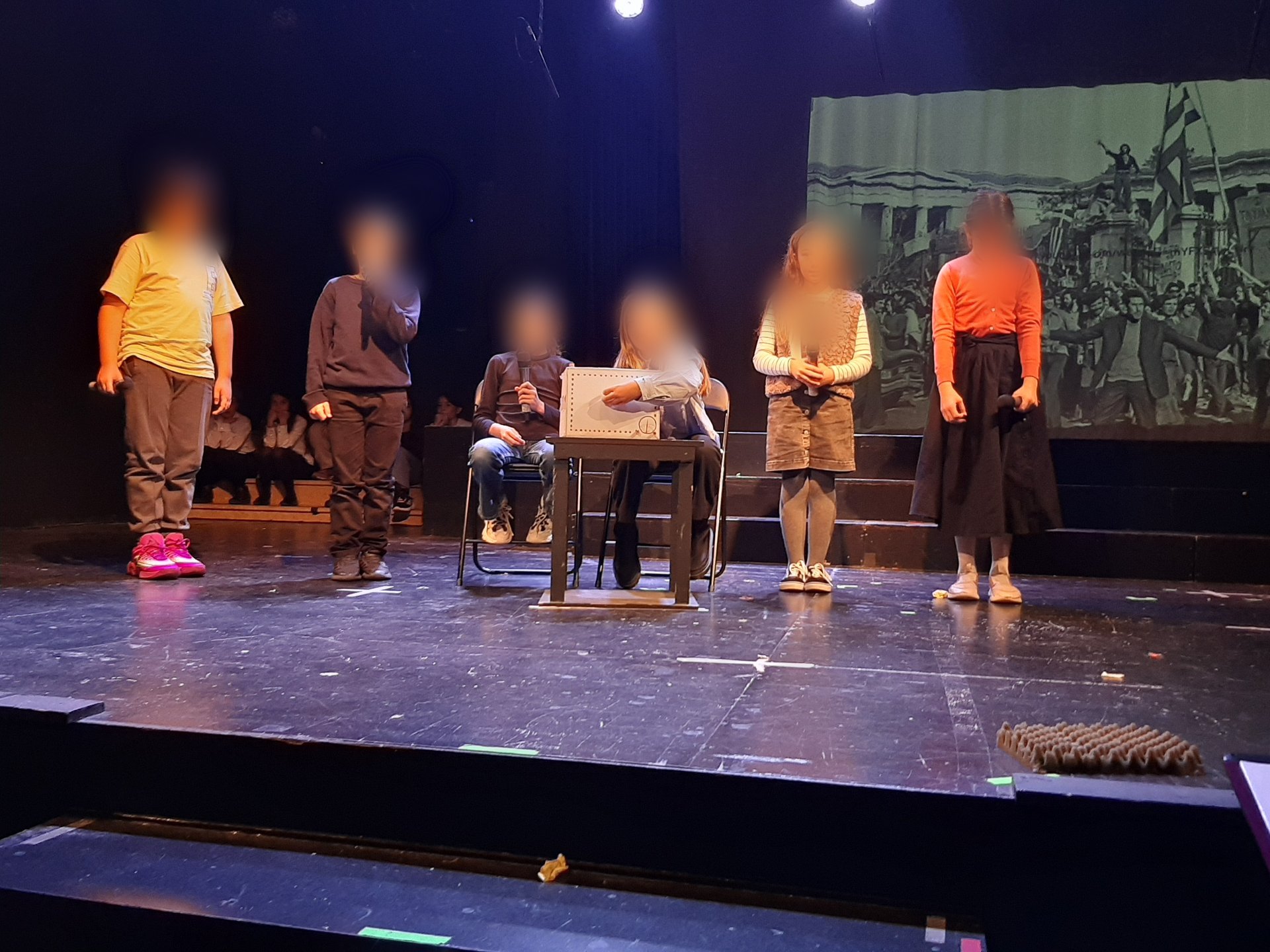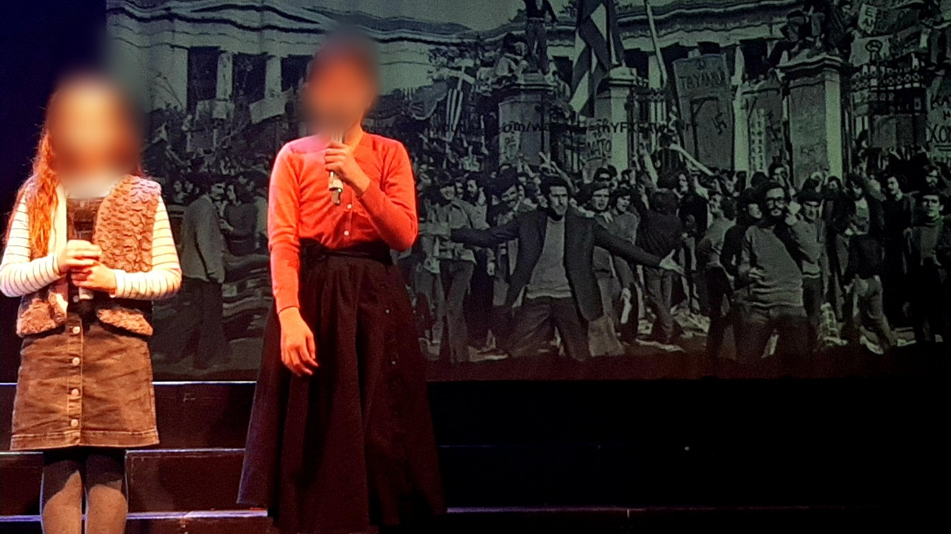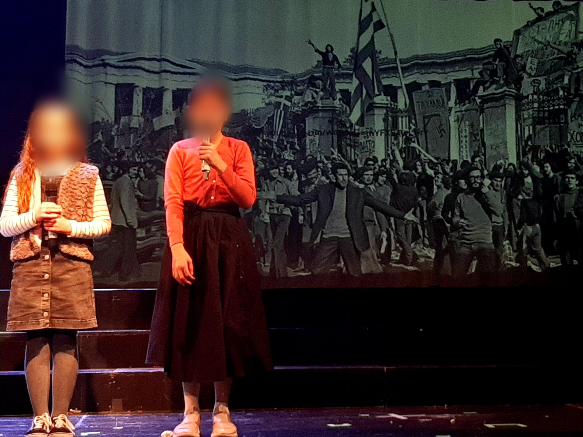 Μαθήτριες και μαθητές της Ε' τάξης με τη συνδρομή της Χορωδίας παρουσίασαν μια σπονδυλωτή και άρτια παρουσίαση όλων των γεγονότων που στιγμάτισαν ανεξίτηλα εκείνο το βράδυ της 17ης Νοέμβρη του 1973...