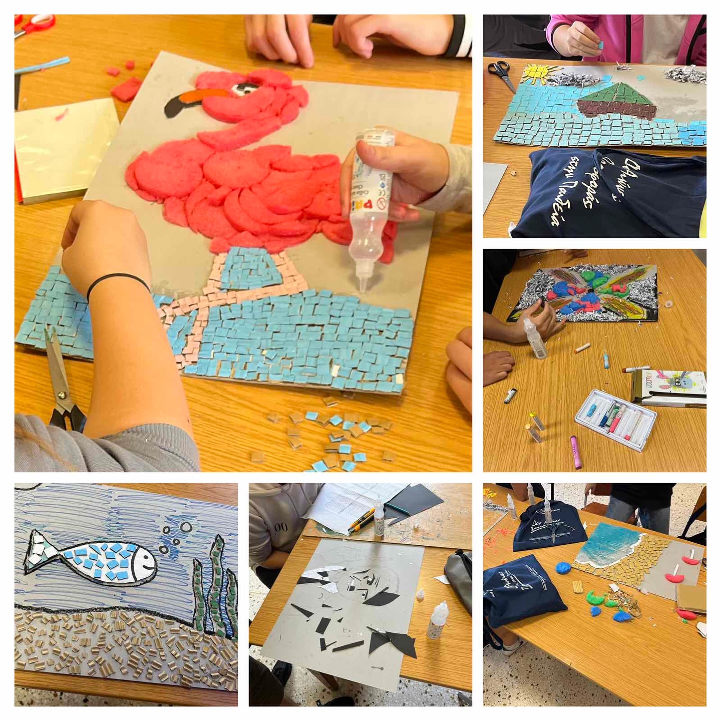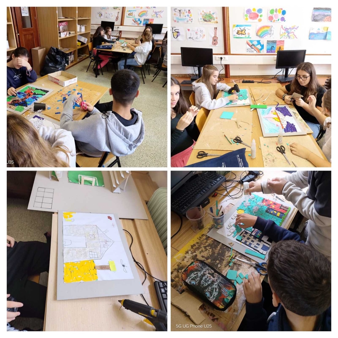 Στο πρακτικό μέρος, οι μαθητές αξιοποίησαν ανακυκλώσιμα υλικά για να δημιουργήσουν ψηφιδωτά έργα τέχνης, αποτυπώνοντας μέσα από τη φαντασία και τη δημιουργικότητά τους όσα αγαπούν και όσα θέλουν να προστατεύσουν στο περιβάλλον.