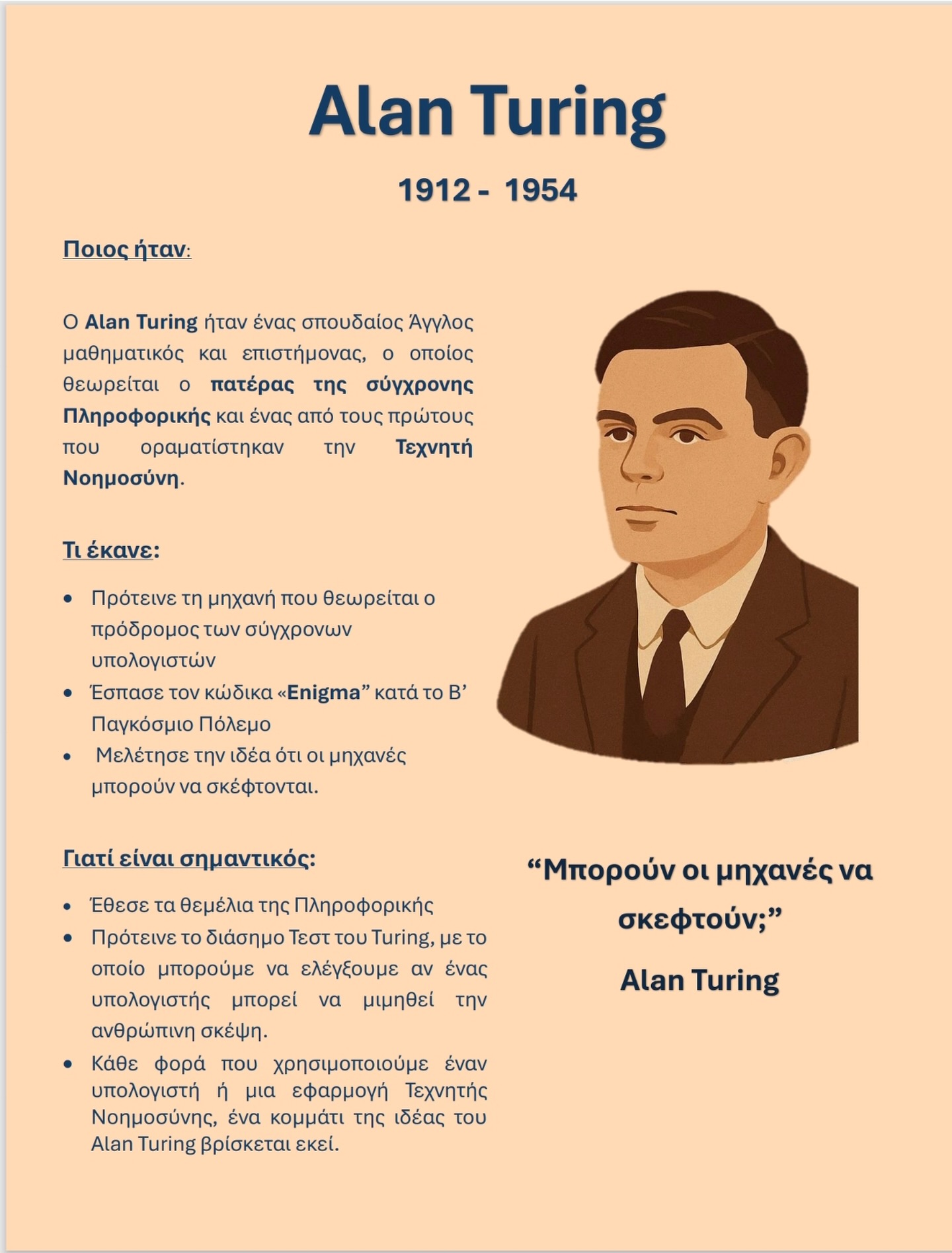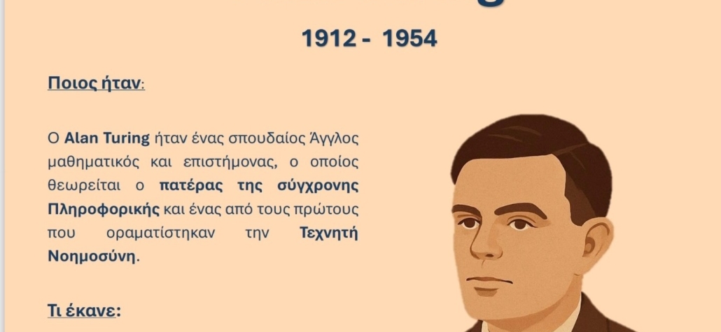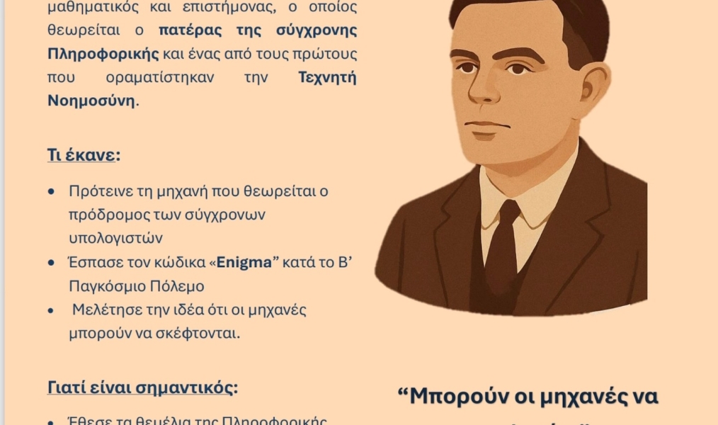 Τον Νοέμβριο, λοιπόν, επιστήμονας του μήνα είναι ο Alan Turing, ένας από τους σημαντικότερους πρωτοπόρους της Πληροφορικής. Θεωρείται «πατέρας της τεχνητής νοημοσύνης» και οι ιδέες του έθεσαν τα θεμέλια των σύγχρονων υπολογιστών.