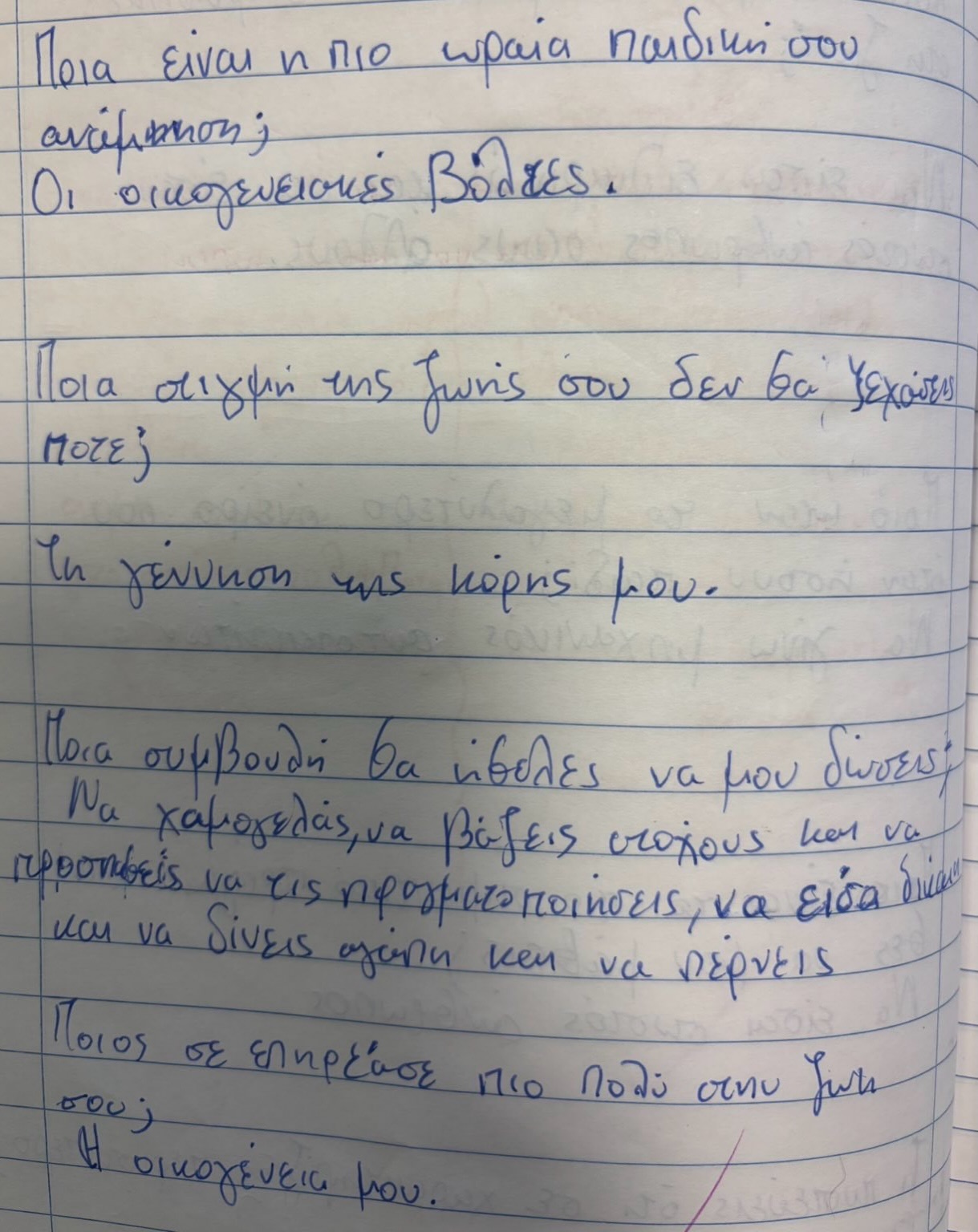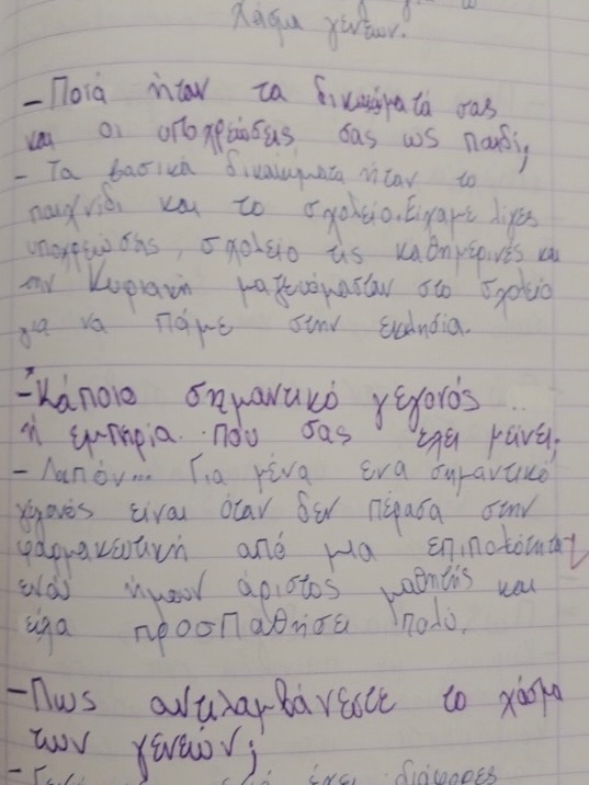 Οι μαθητές ζήτησαν από τους δικούς τους ανθρώπους να αφηγηθούν ιστορίες από την παιδική ή τη νεανική τους ηλικία, να αναρωτηθούν για τη ζωή των νέων σήμερα, να μοιραστούν φόβους, χαρές… την ψυχή και τη ζωή τους.