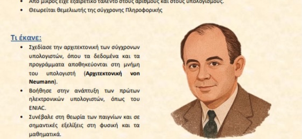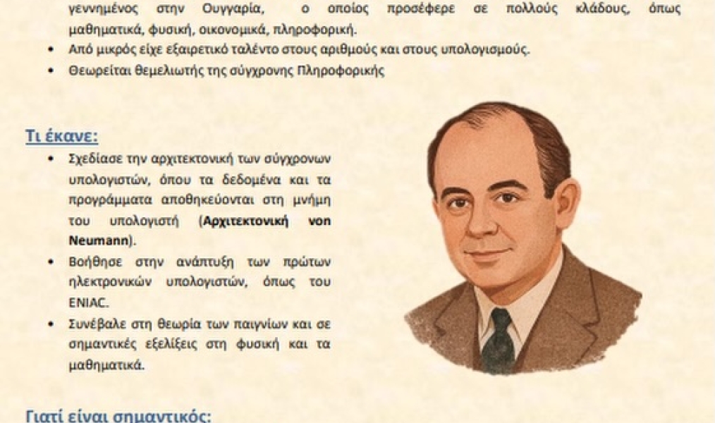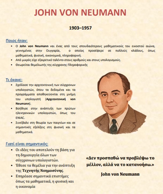 Ο John Von Neumann γεννήθηκε στις 28.12.1903 στη Βουδαπέστη και θεωρείται ένας από τους μεγαλύτερους μαθηματικούς του 20ου αιώνα, του οποίου το έργο αποτελεί ένα από τα βασικά θεμέλια της κβαντικής μηχανικής, λογικής, μαθηματικής οικονομικής θεωρίας και της βαλλιστικής.