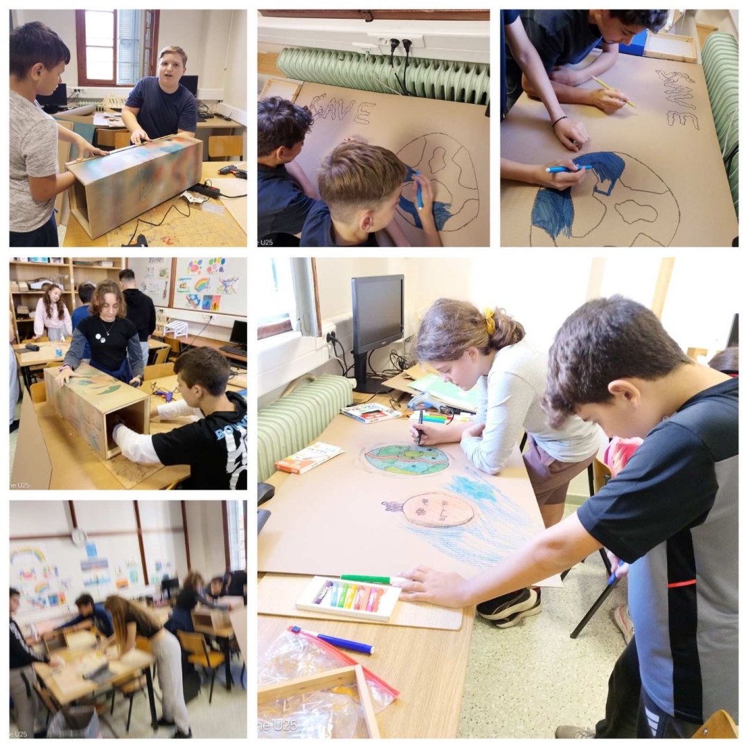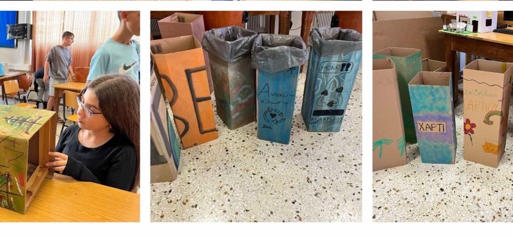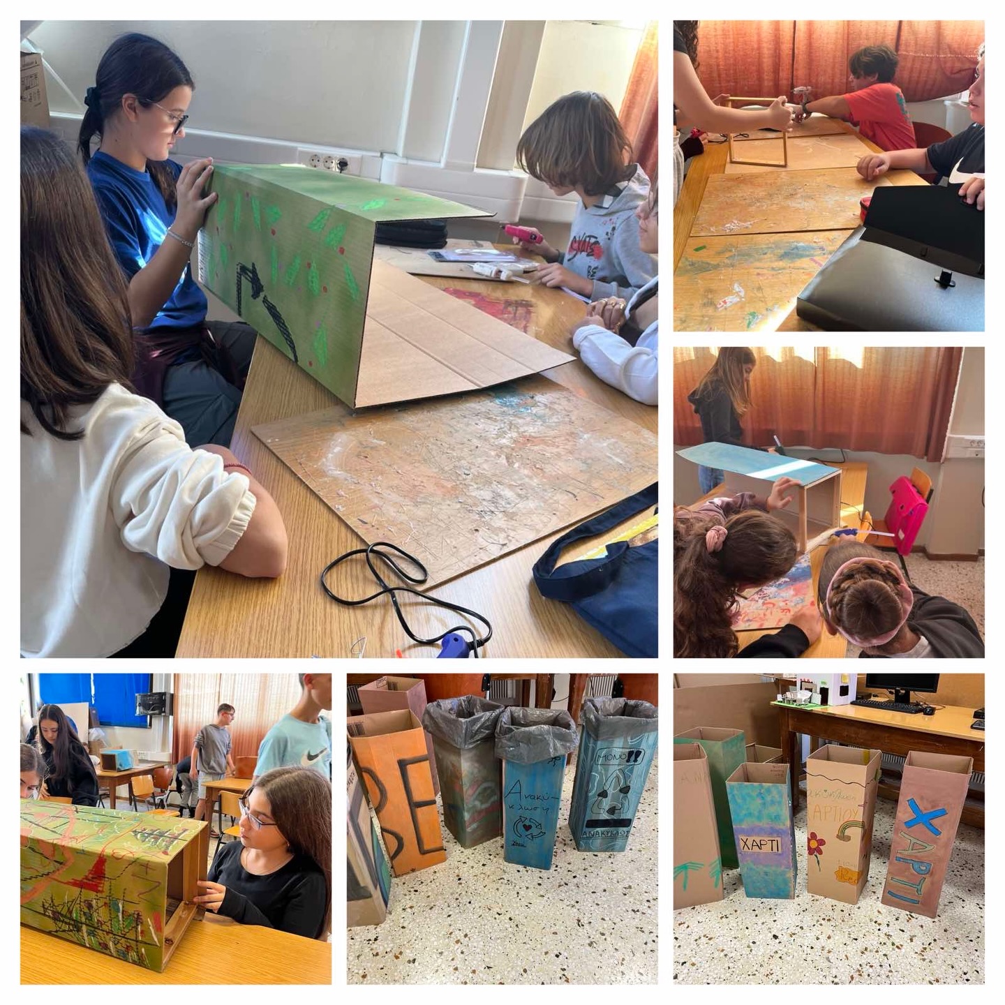 Στο πλαίσιο της προσπάθειας μείωσης του ανθρακικού αποτυπώματος του σχολείου μας, το τμήμα Τεχνολογίας του Γυμνασίου , και ειδικότερα οι κ.κ.Στεφανία Μπουρλη και Σίσσυ Κρητικοπούλου είχαν την σκέψη να κατασκευαστούν από τα ίδια τα παιδιά, κάδοι ανακύκλωσης πλαστικού για κάθε ένα από τα τμήματα της κάθε τάξης Α’, Β’, Γ’ Γυμνασίου.
