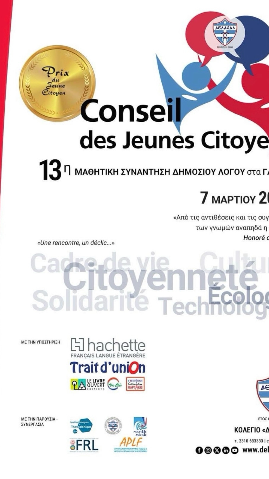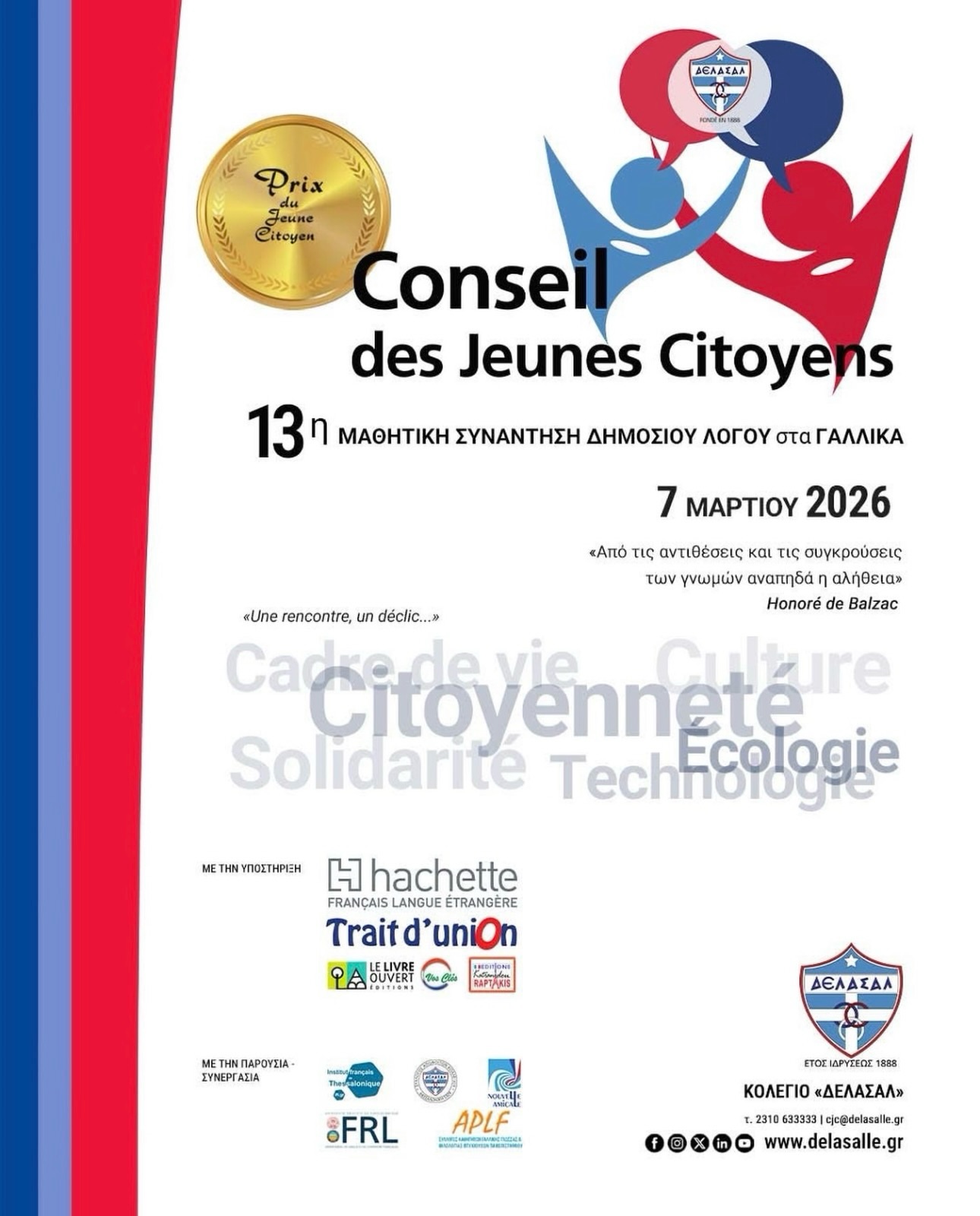 Το Σάββατο 7 Μαρτίου 2026 πραγματοποιήθηκε το 13ο Συνέδριο Δημόσιου Λόγου στις εγκαταστάσεις του Ελληνογαλλικού Κολλεγίου Δελασάλ στη Θεσσαλονίκη.