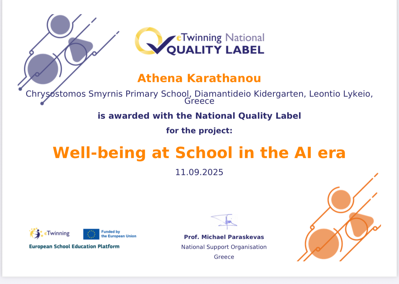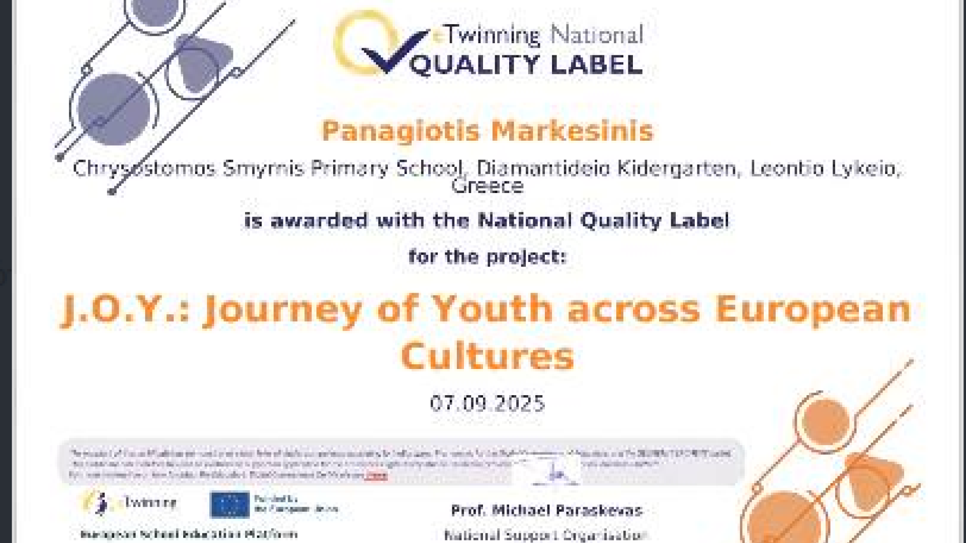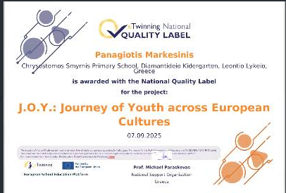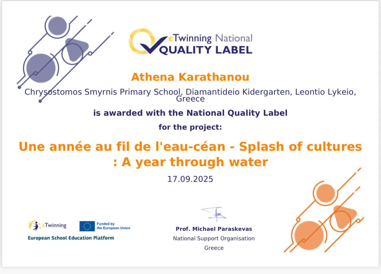 Τέσσερα καινοτόμα έργα eTwinning στα οποία συμμετείχαν μαθητές και μαθήτριες του σχολείου μας, "Splash of Cultures: A Year through water," "J.O.Y. Journey of Youth Across European Cultures," "Together for Wellness" και "Well-being at school in the AI era" έλαβαν Εθνικές Ετικέτες Ποιότητας για την εξαιρετική τους υλοποίηση.