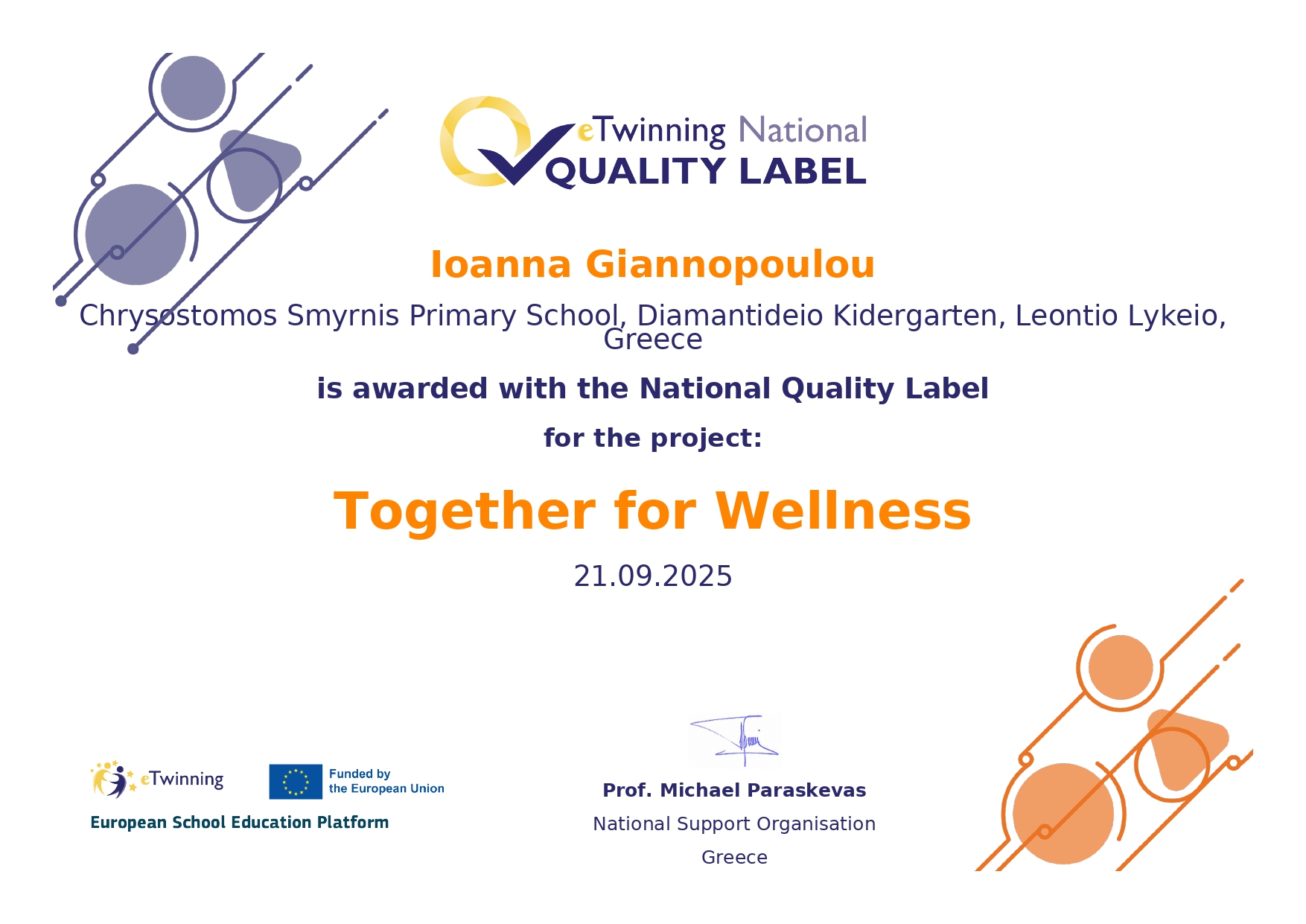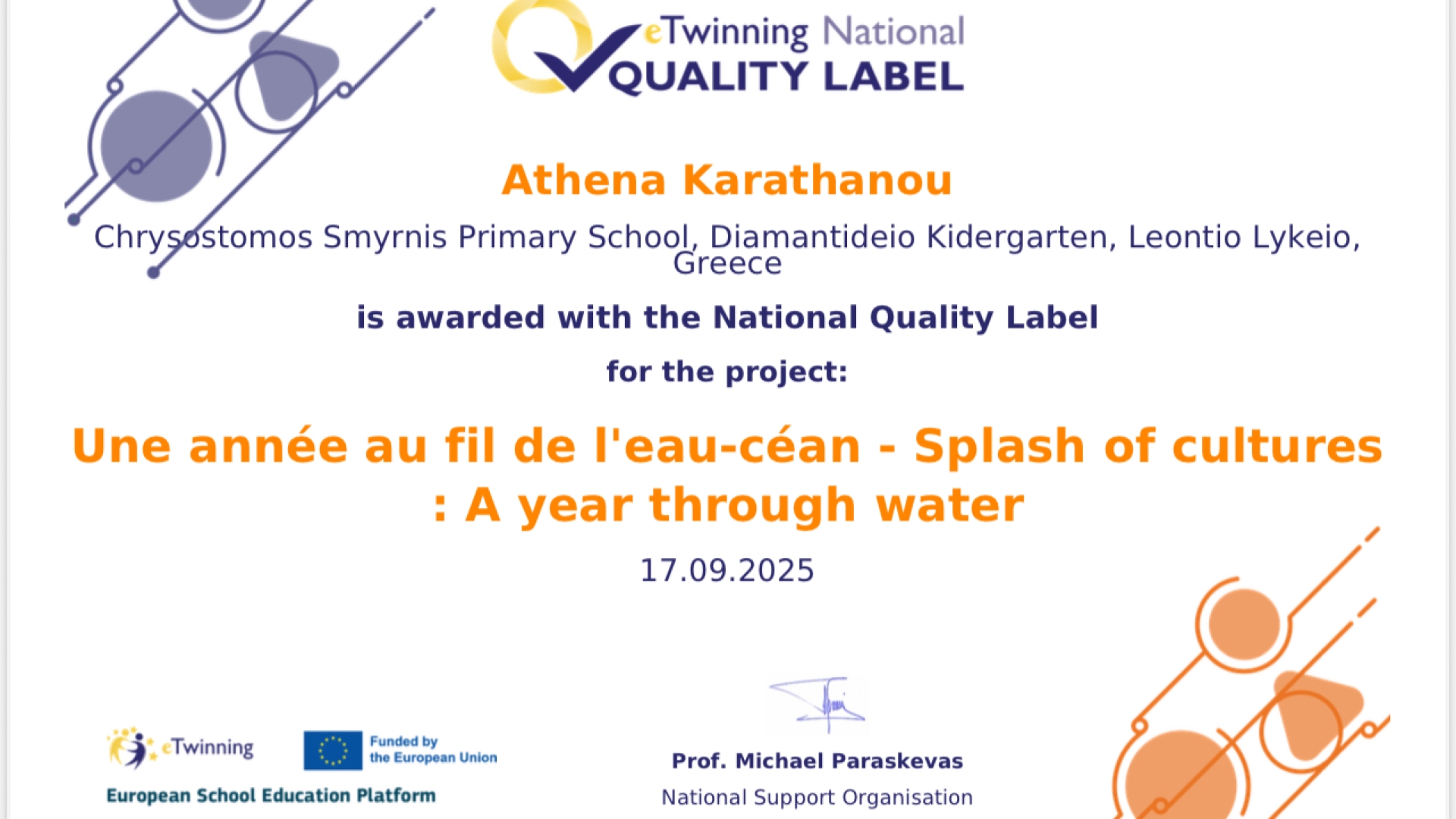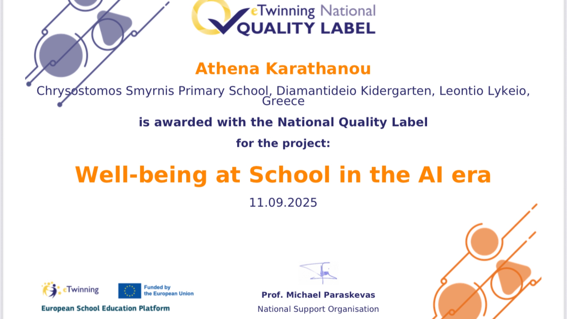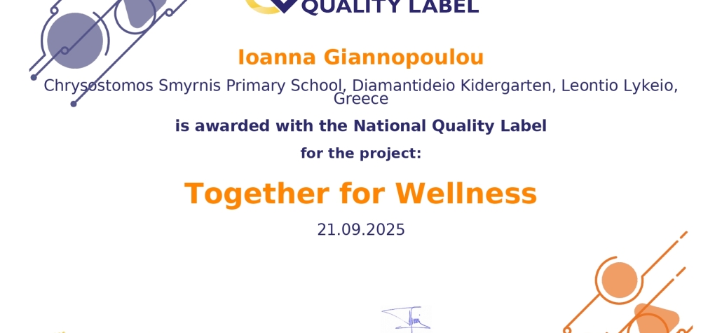 Τέσσερα καινοτόμα έργα eTwinning στα οποία συμμετείχαν μαθητές και μαθήτριες του σχολείου μας, "Splash of Cultures: A Year through water," "J.O.Y. Journey of Youth Across European Cultures," "Together for Wellness" και "Well-being at school in the AI era" έλαβαν Εθνικές Ετικέτες Ποιότητας για την εξαιρετική τους υλοποίηση.